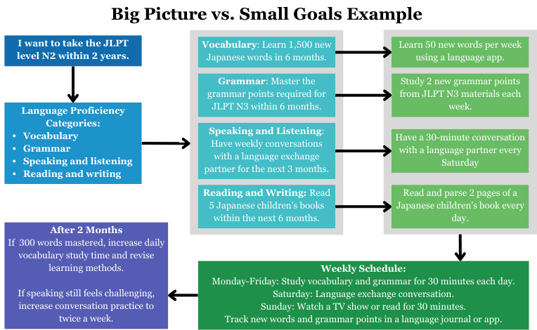 This method emphasizes balancing long-term, overarching goals (the “big picture”) with smaller, manageable tasks (“small goals”). Breaking large goals into smaller steps makes them less overwhelming and provides motivation as each small goal is achieved, keeping you on track to reach the larger objective.